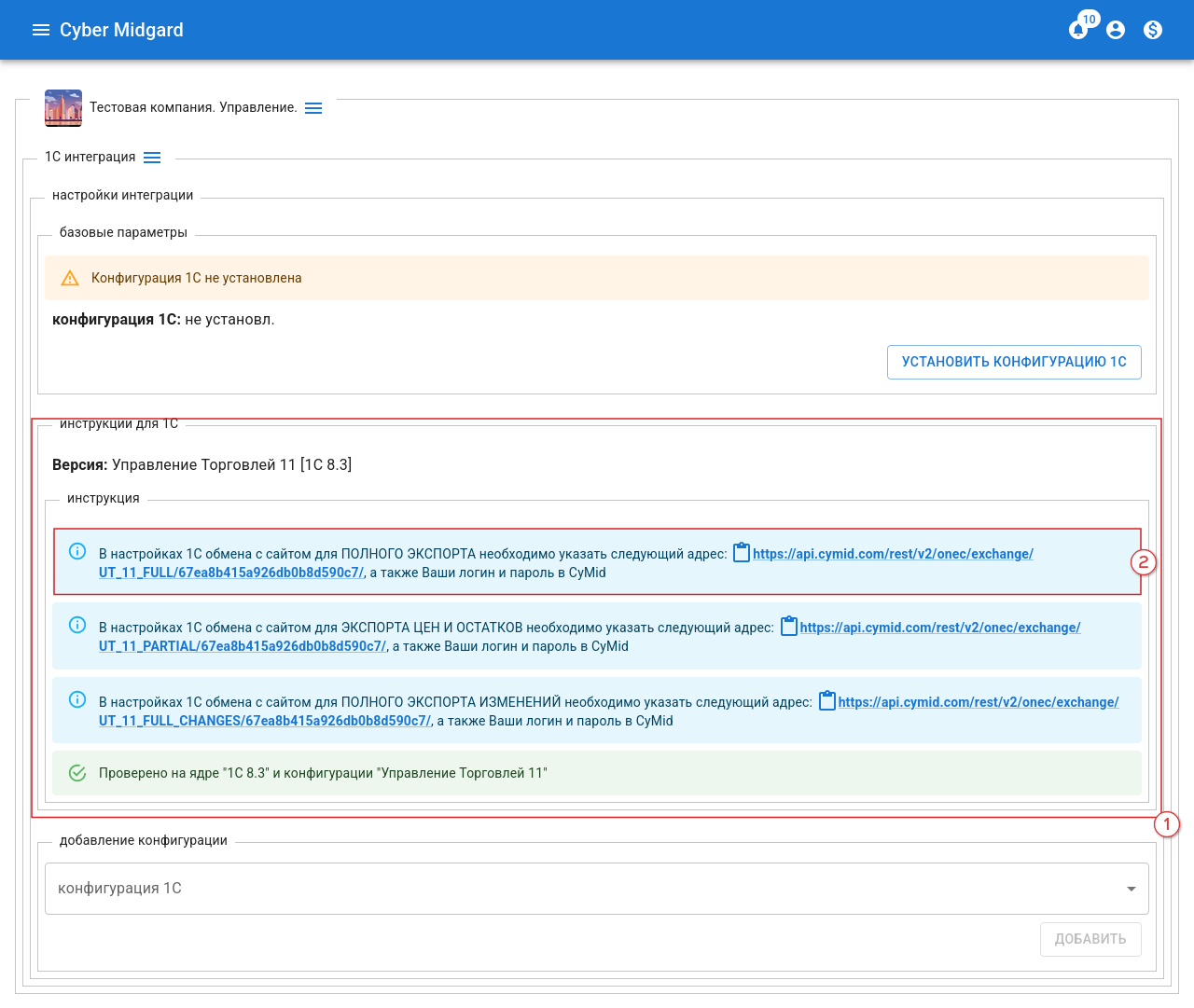 Адрес сайта (рис. 16, 5). Ссылка, скопированная из кабинета компании в CyMid. Расположение: Переходим “CyMid Кабинет Компании” → “1С интеграция” (рис. 17, 1). В блоке “инструкции для 1С” (рис. 18, 1) подблок (рис. 18, 2).