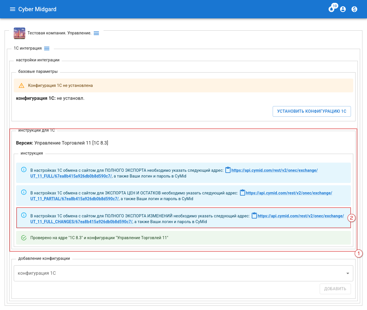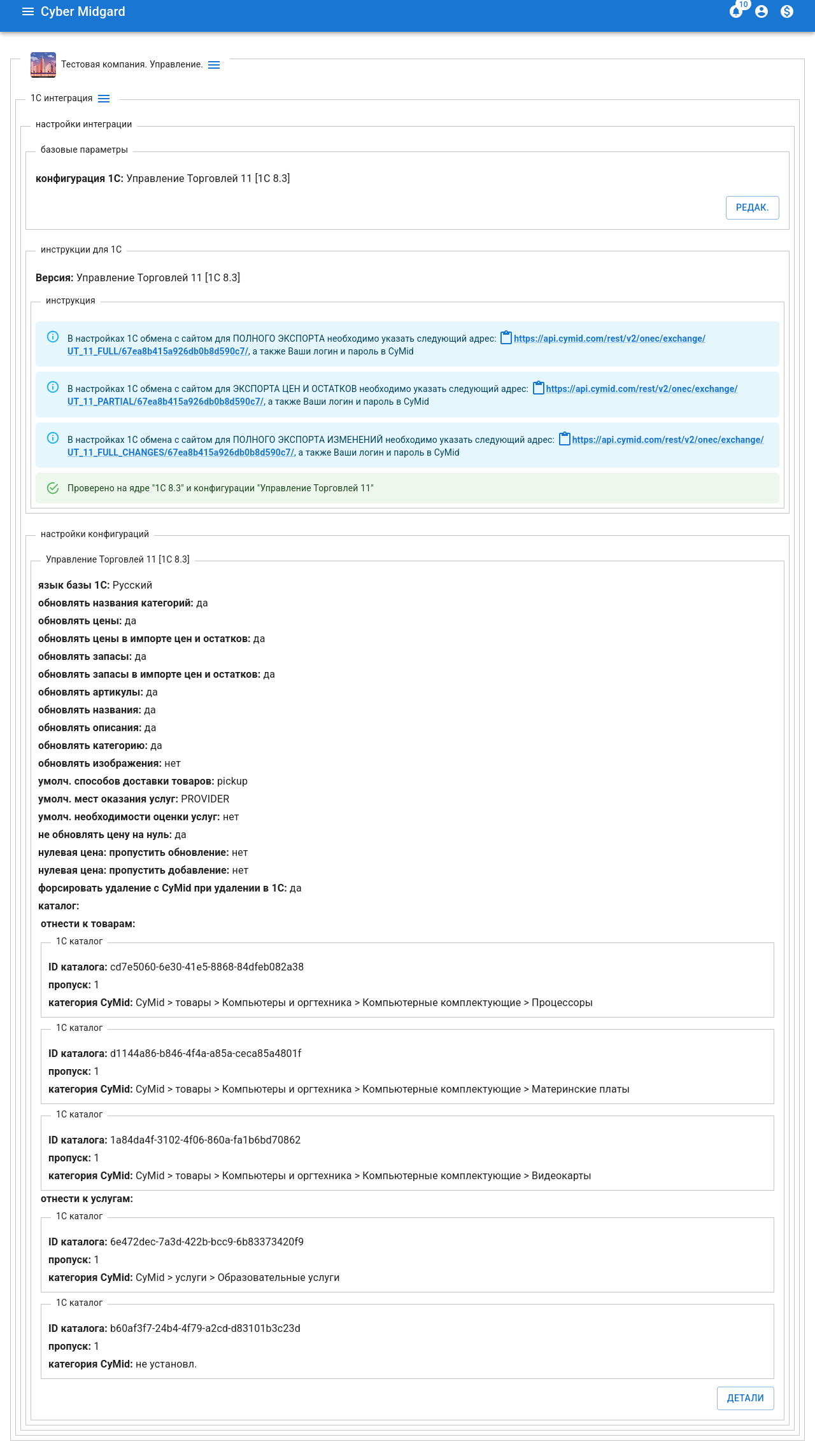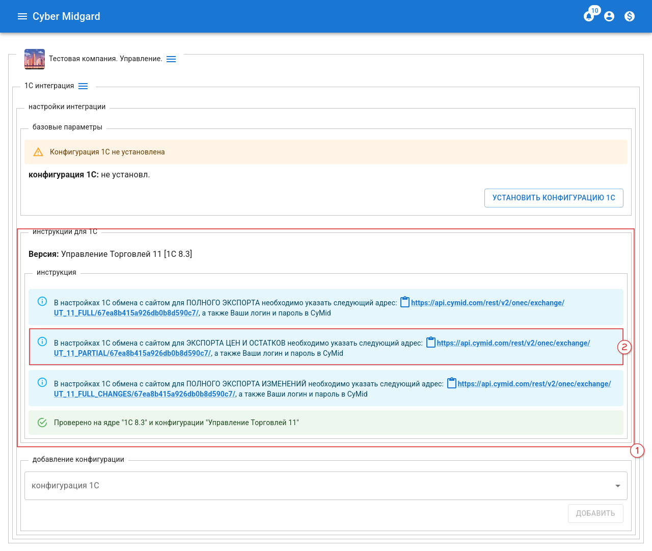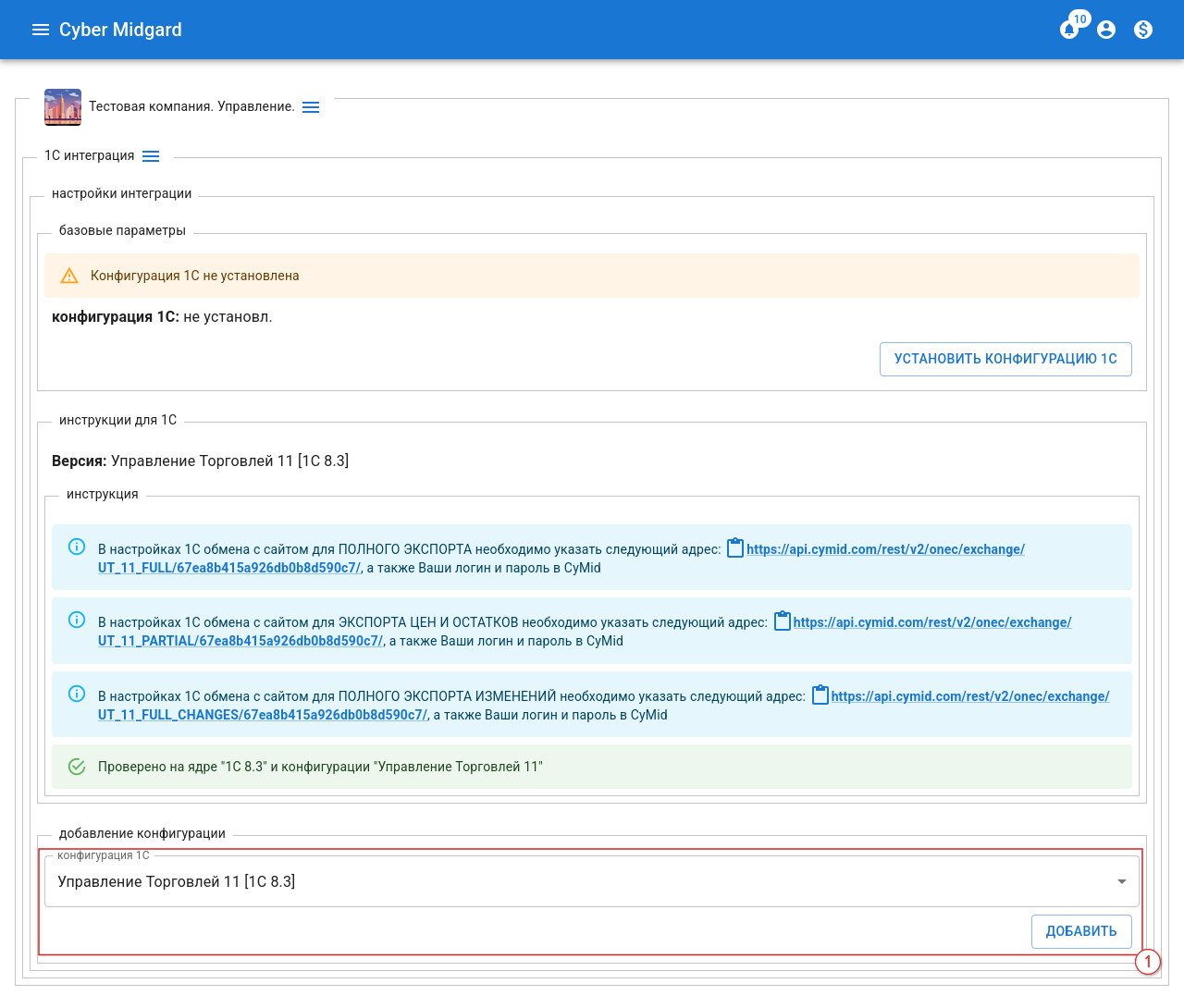 Рисунок 16 - Обмен с CyMid AP. Основные настройкиРисунок 17 - CyMid Кабинет КомпанииРисунок 18 - 1С Интеграция