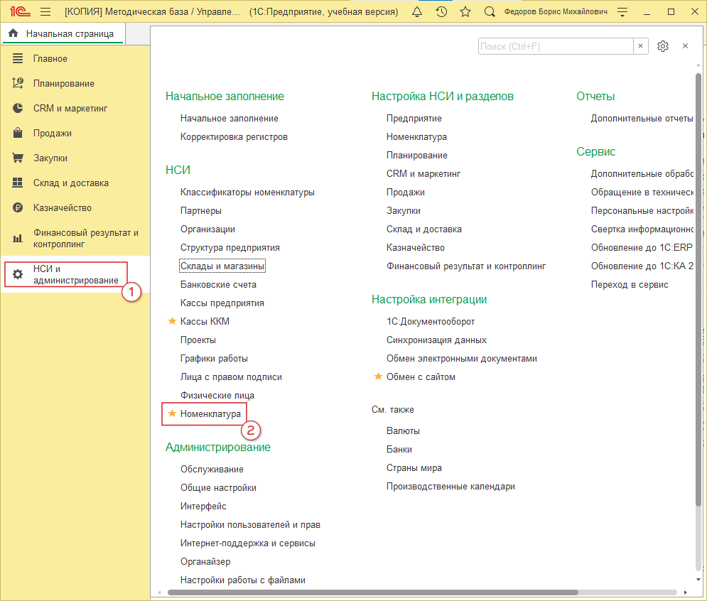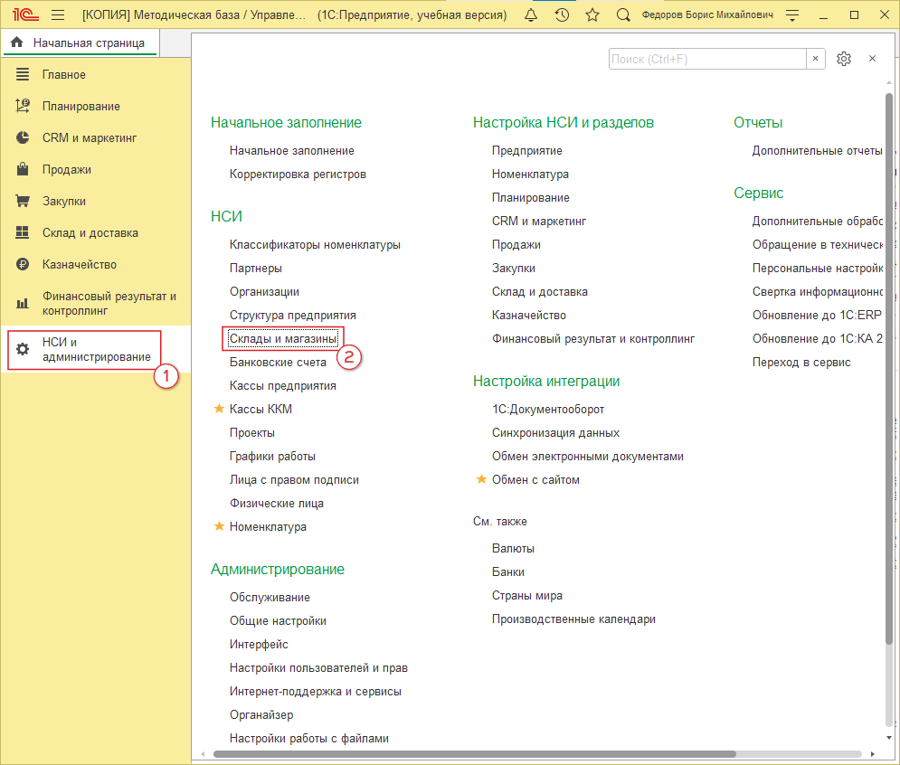 Для корректного экспорта цен и остатков необходимо создать новый или правильно настроить существующий склад ("ИнтернетМагазин"). Переходим в 1С: “НСИ и администрирование” (рис. 1, 1) → “Склады и магазины” (рис. 1, 2):