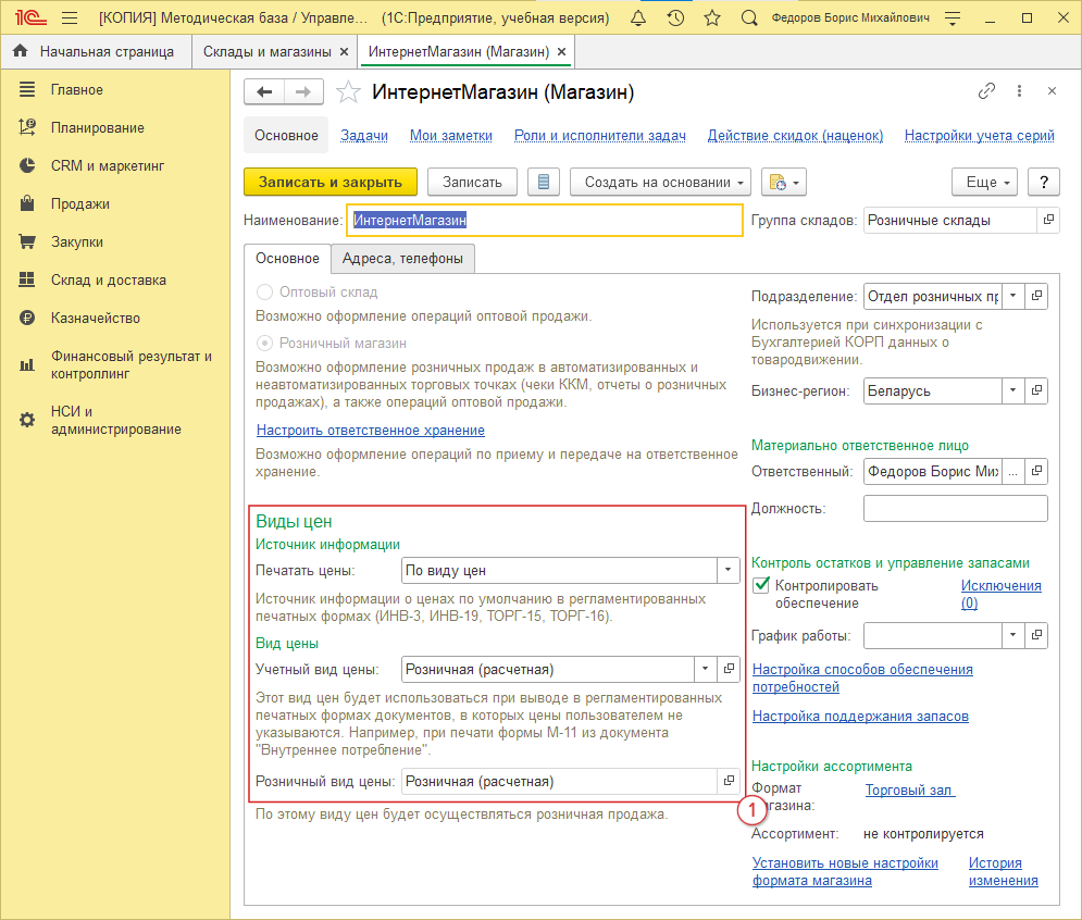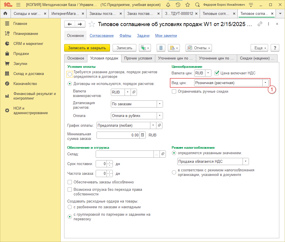 Во вкладке “Условия продаж” выберите вид цен для экспорта (рис. 7, 1). Он должен совпадать с видом цены для склада (рис. 2, 1), ("Розничная (расчетная)")