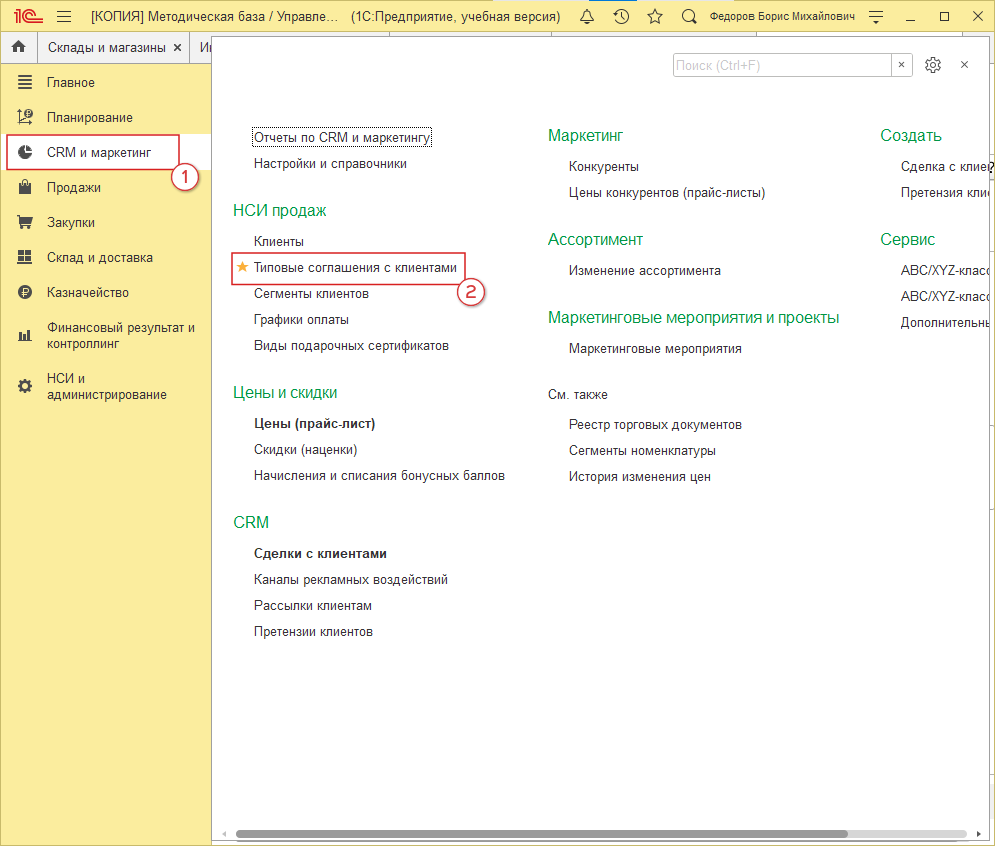 Переходим в 1С: “CRM и маркетинг” (рис. 5, 1) → “Типовые соглашения с клиентами” (рис. 5, 2):
