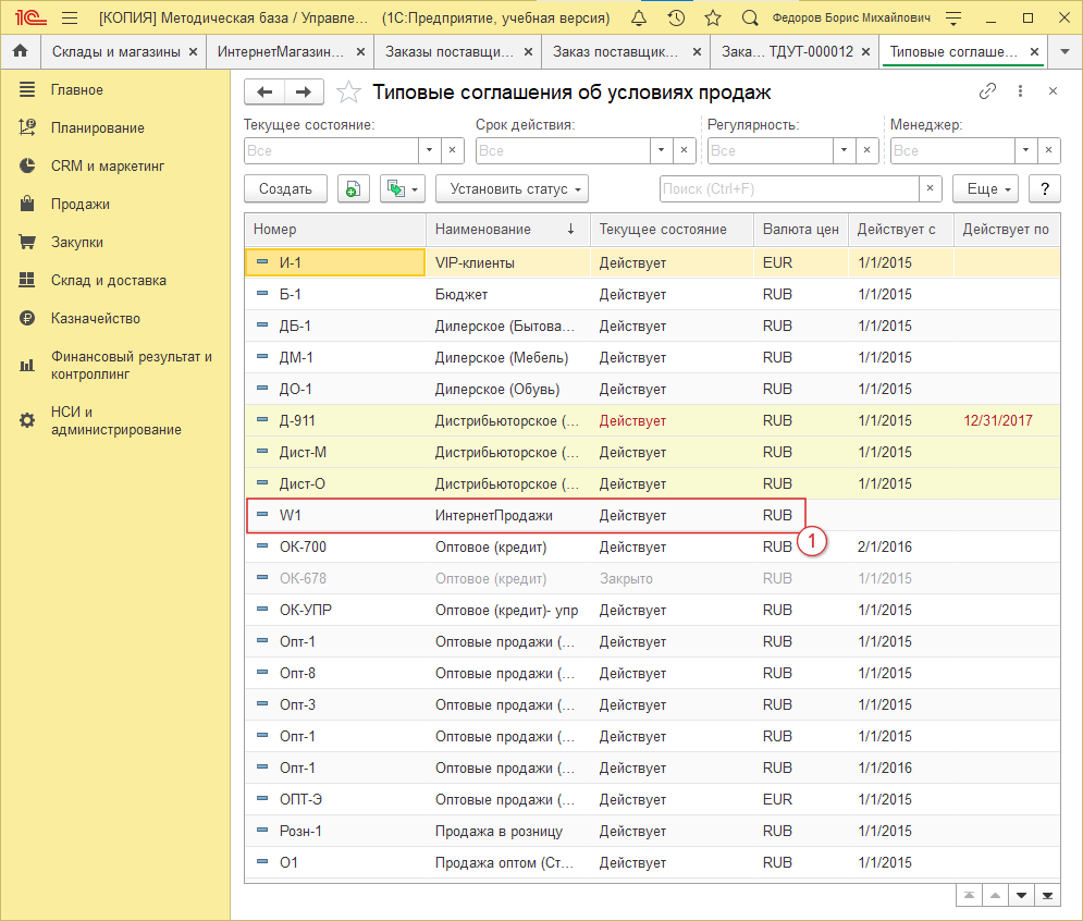 Создаем новое соглашение, либо настраиваем существующее (W1 "ИнтернетПродажи") (рис. 6, 1):