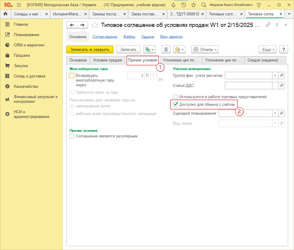 Во вкладке “Прочие условия” (рис. 8, 1) обязательно отметьте “Доступно для обмена с сайтом” (рис. 8, 2):