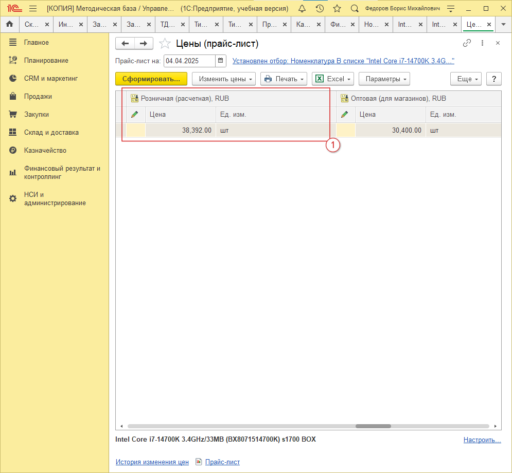 В секции “Виды цен” (рис. 2, 1) выбираем цену, которая будет использована для экспорта ("Розничная (расчетная)"):