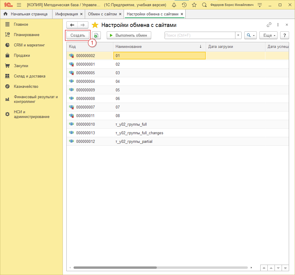Переходим в 1С: “НСИ и администрирование” (рис. 13, 1) → “Обмен с сайтом” (рис. 13, 2):