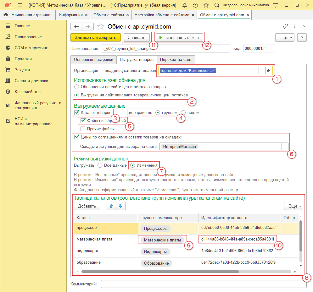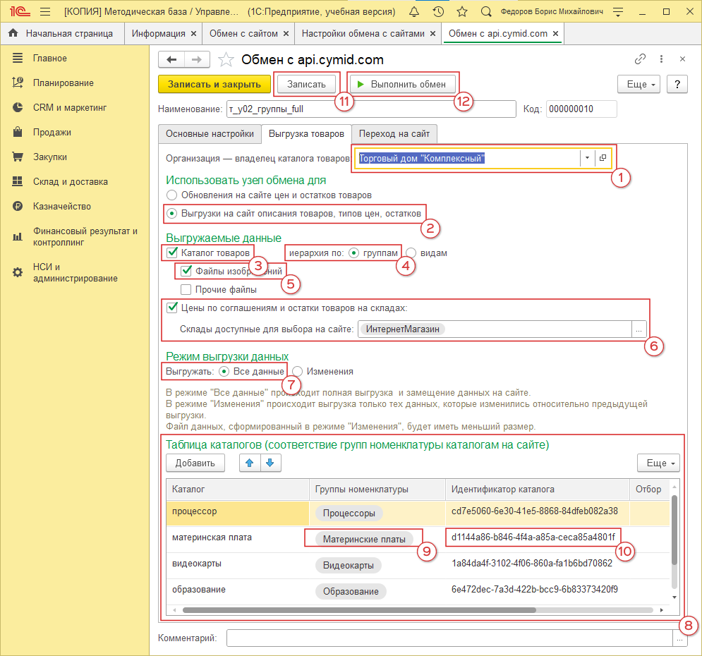 В блоке “Таблица каталогов” (рис. 19, 8) из групп номенклатуры (рис. 19, 9) формируем каталоги для экспорта. Если это первое конфигурирование обмена - позволяем 1С сформировать идентификатор каталога (рис. 19, 10) автомаически. Содержимое этого блока - одинаково для всех 3-х типов экспорта.