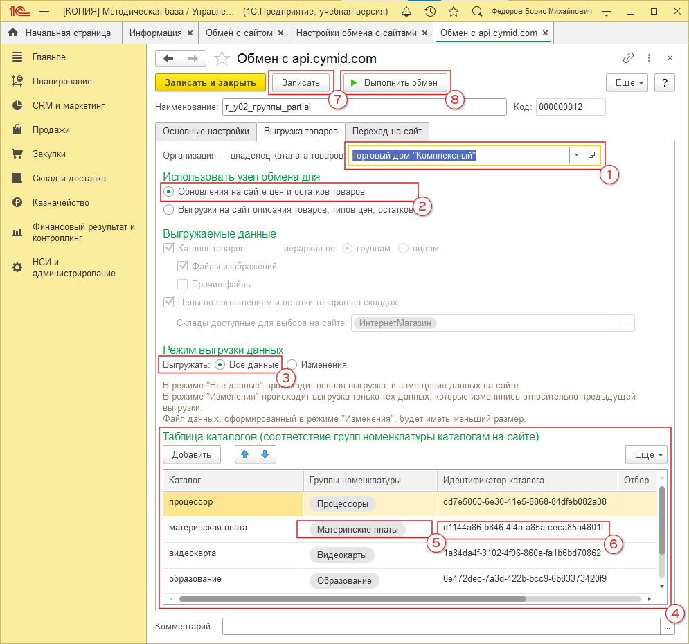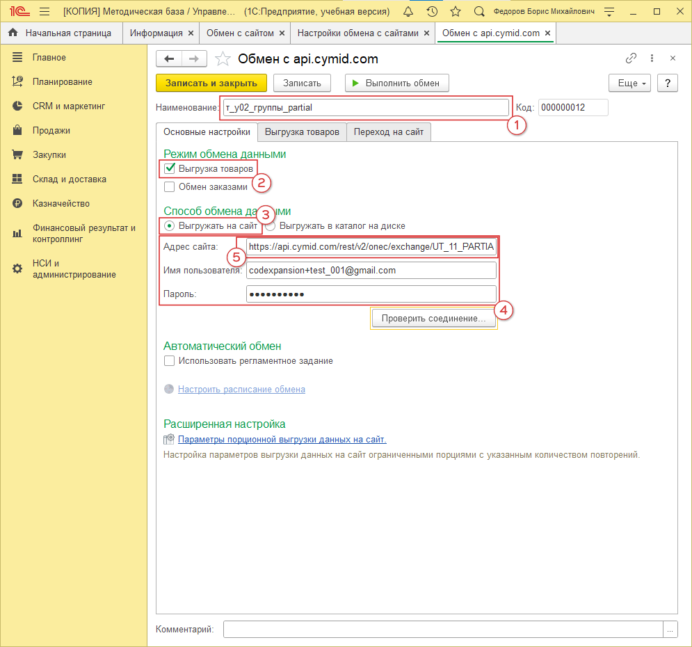 Способ обмена данными. Выбираем “Выгружать на сайт” (рис. 20, 3). Заполняем данные по соединению с CyMid (рис. 20, 4):