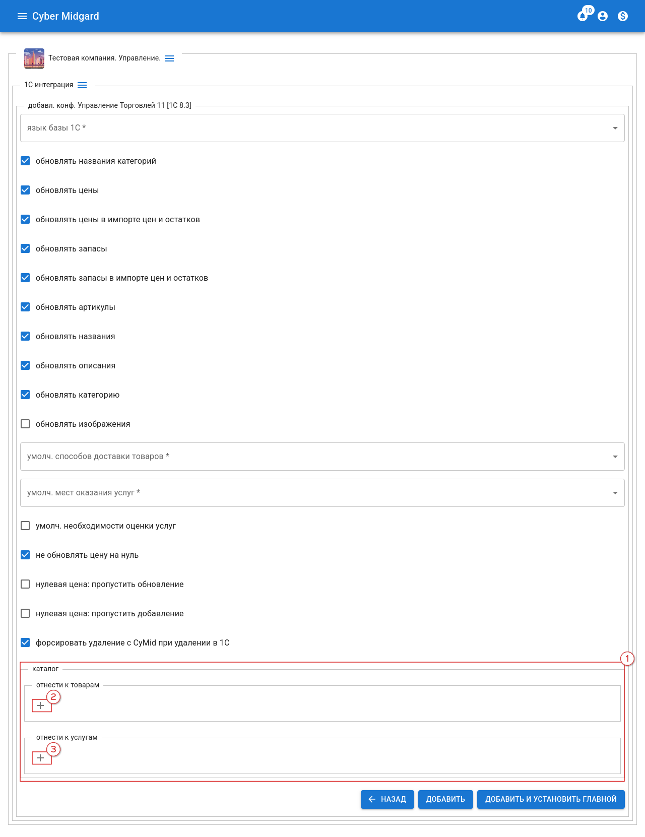 Выставляем предпочтительные настройки и внимательно заполняем блок “каталог” (рис. 30, 1) используя кнопки добавления (рис. 30, 2,3)