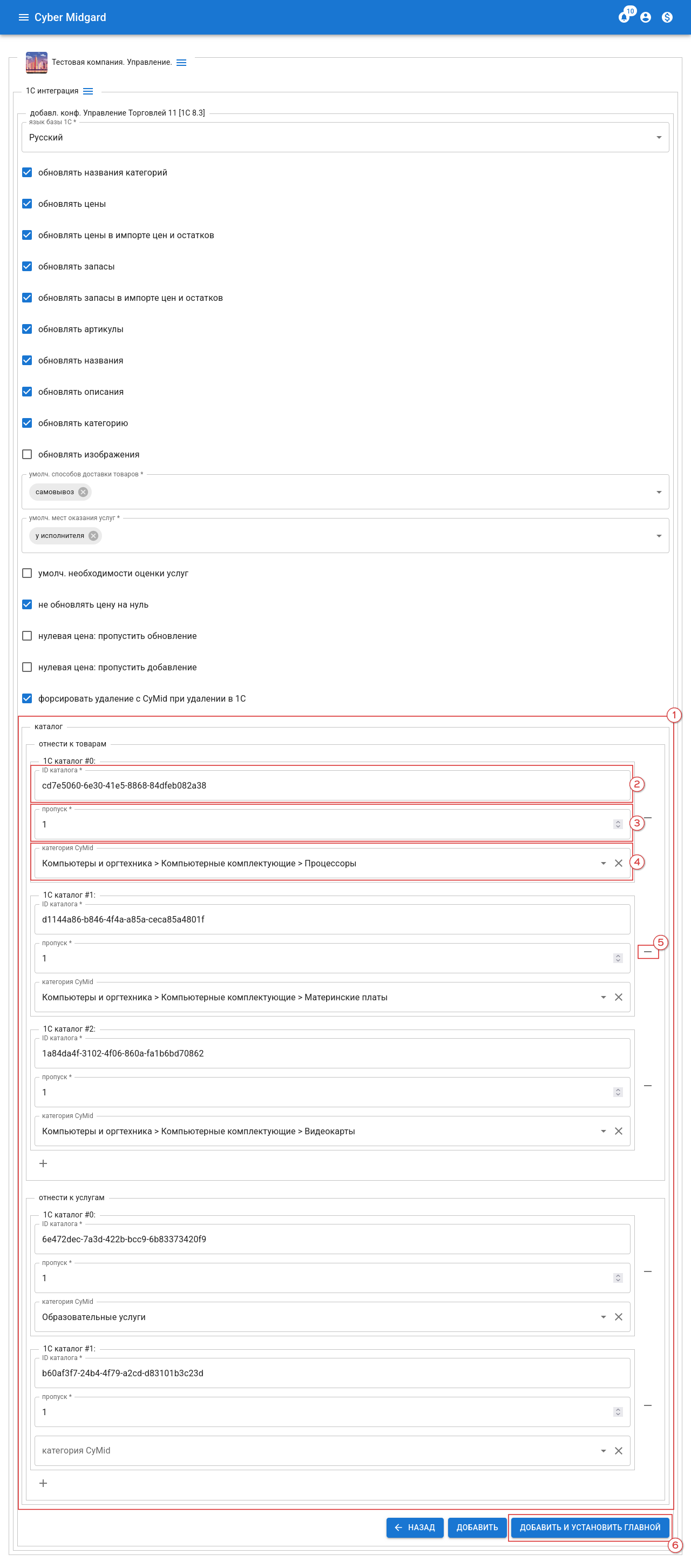 По завершении работы с опциями экспорта и каталогом жмем “добавить и установить главной” (рис. 33, 6). Этап “Подключения в 1С ” Интеграция 1С в целом завершены. Результат для нашего примера изображен на рис. 34.